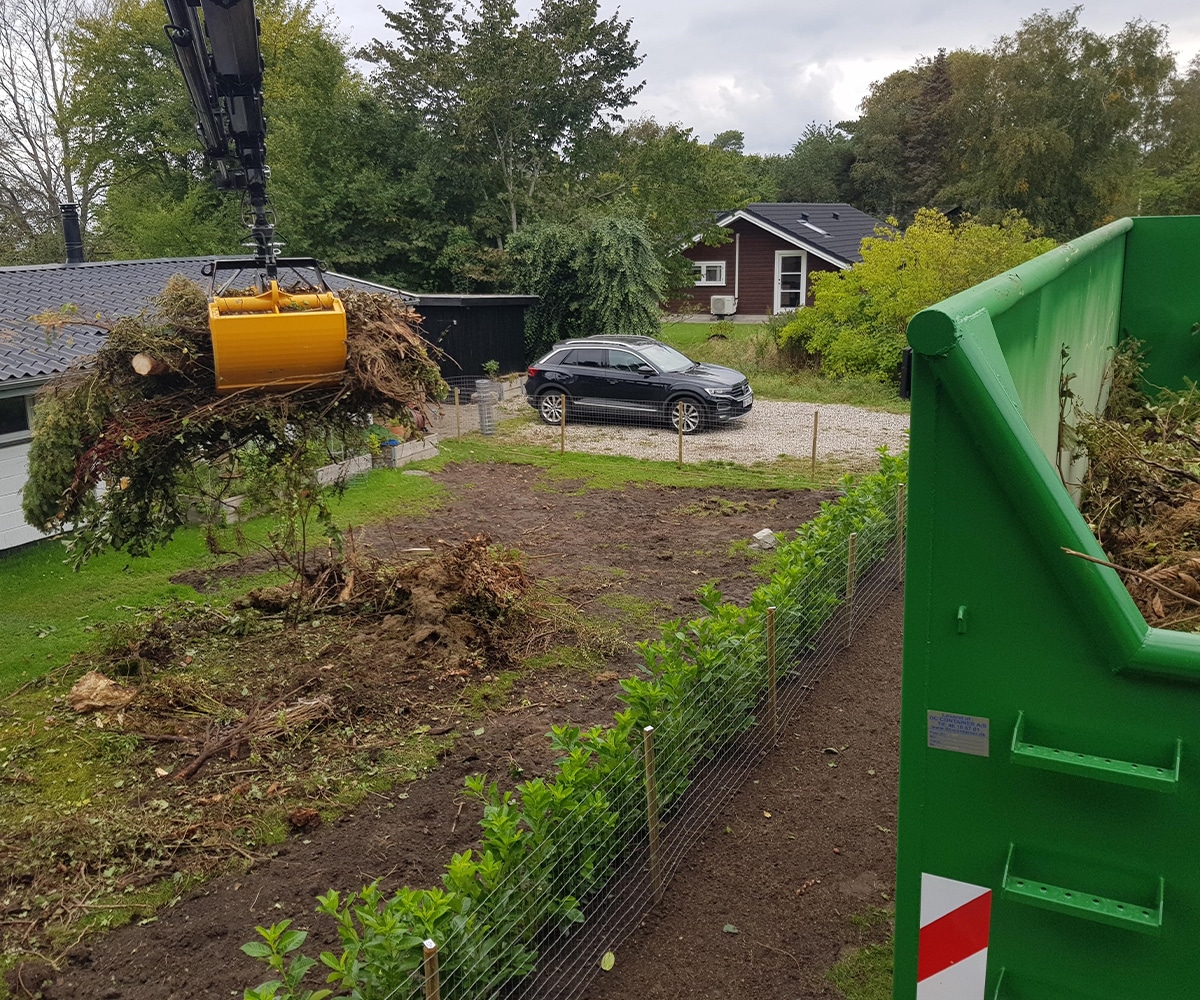 Vi kan samtidigt også levere materialer med kranen, hvis du vil have det anbragt på en anden side af et hegn eller en hæk – f.eks. hvis det ikke er muligt at komme ind på grunden med lastbilen.